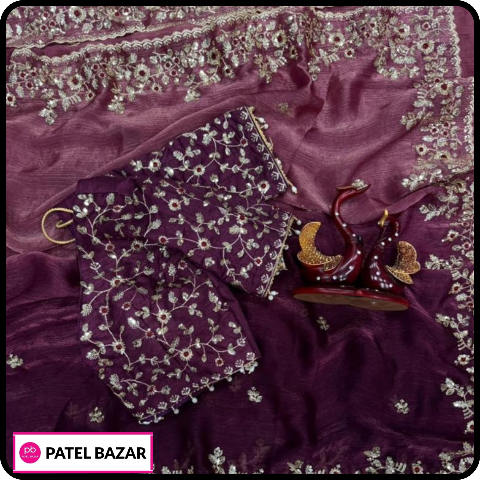 This is a space silk saree with a crushed padding texture. It features embroidery work with a touch of sequin. The saree comes with an unstitched silk blouse that also has work on it.