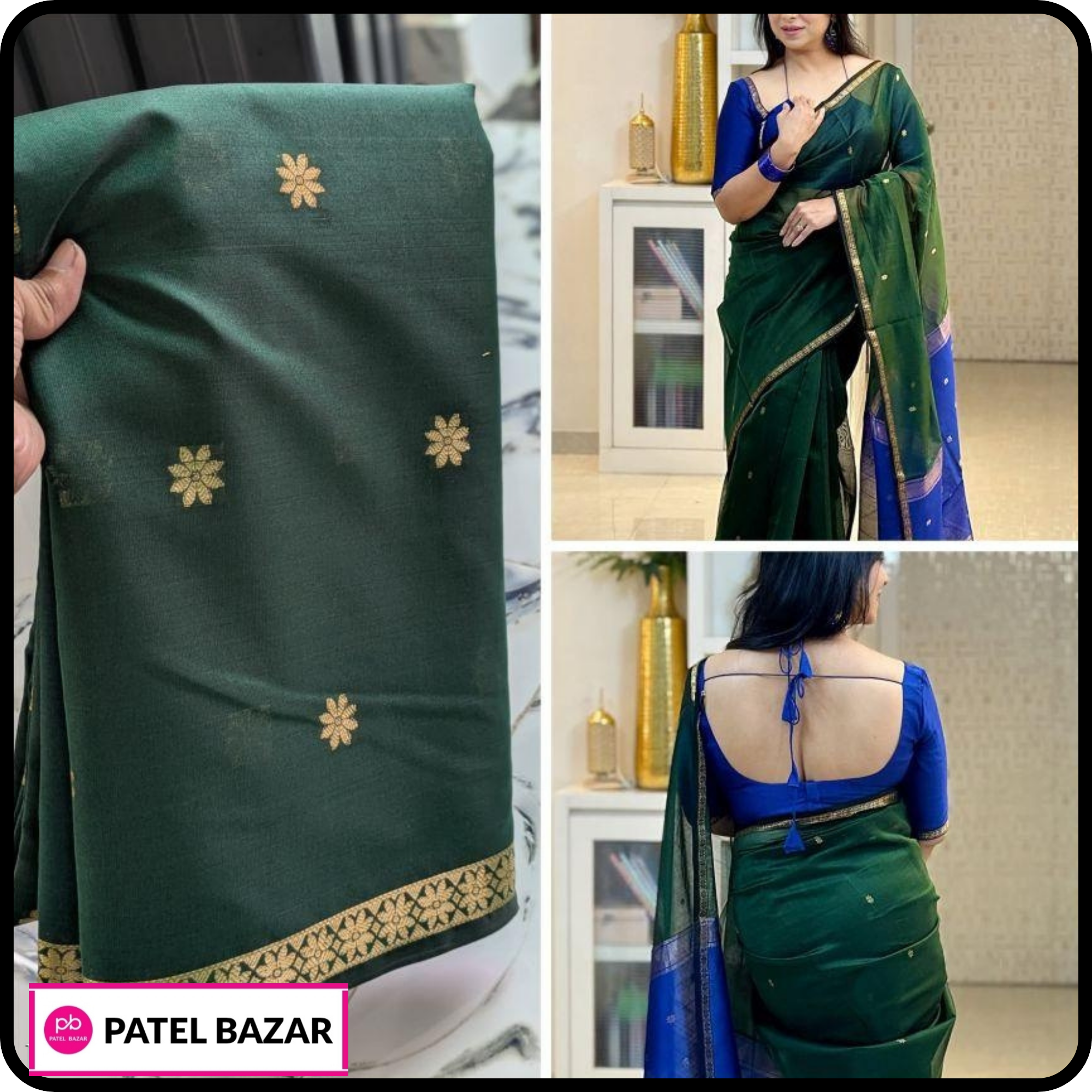 This is a Banarasi cotton saree with a blouse included. The length of the saree is 6.50 meters. It features a 'chit pallu anchal' design. The fabric and style are mentioned in the product details.
